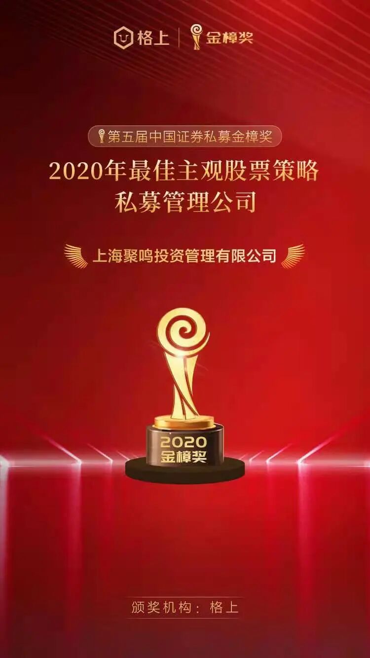 乘风破浪,行稳致远,第五届(2020年度)金樟奖获奖名单揭晓。聚鸣投资凭借稳健出色的业绩荣获金樟奖“2020年最佳主观股票策略私募管理公司”。这是聚鸣投资继获得金樟奖“2019年度最佳新锐私募管理公司”后,再一次在金樟奖的评选中脱颖而出。聚鸣自2017年12月运作私募权益产品以来,凭借稳健的业绩和兢业的经营快速成长为百亿私募管理人。接下来我们将继往开来,在跌宕起伏的资本市场中乘风破浪稳健前行,不负投资人和销售机构重托,追求投资收益的中长期稳健增长。